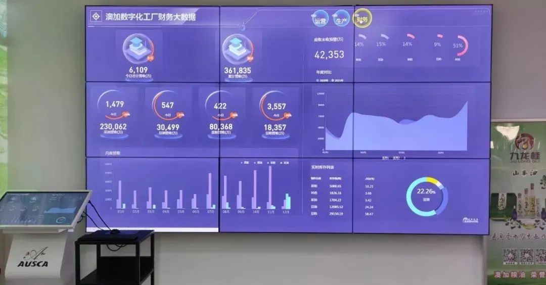 在澳加糧油的生產車間現場,設備與系統成功互聯,各項生產數據及時回傳金蝶云星空,自動化高效作業,不浪費任何資源。車間關鍵位置懸掛電子看板,生產數據全自動采集,生產進度、訂單完成狀況等信息均可通過數據大屏實時展現,車間生產透明可視化。加上云之家的移動應用,對生產、銷售、庫存等數據實時掌握和業務流程高效審批,能快速對市場變化做決策,大大提升企業競爭力。